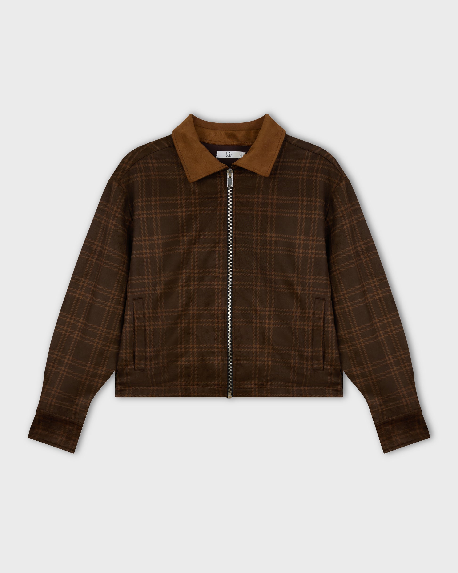 Crafted from supple suede, this cropped jacket features a tailored shape with subtle volume. The zip closure and sculpted collar create a contemporary, polished look, while the checked pattern adds quiet depth.