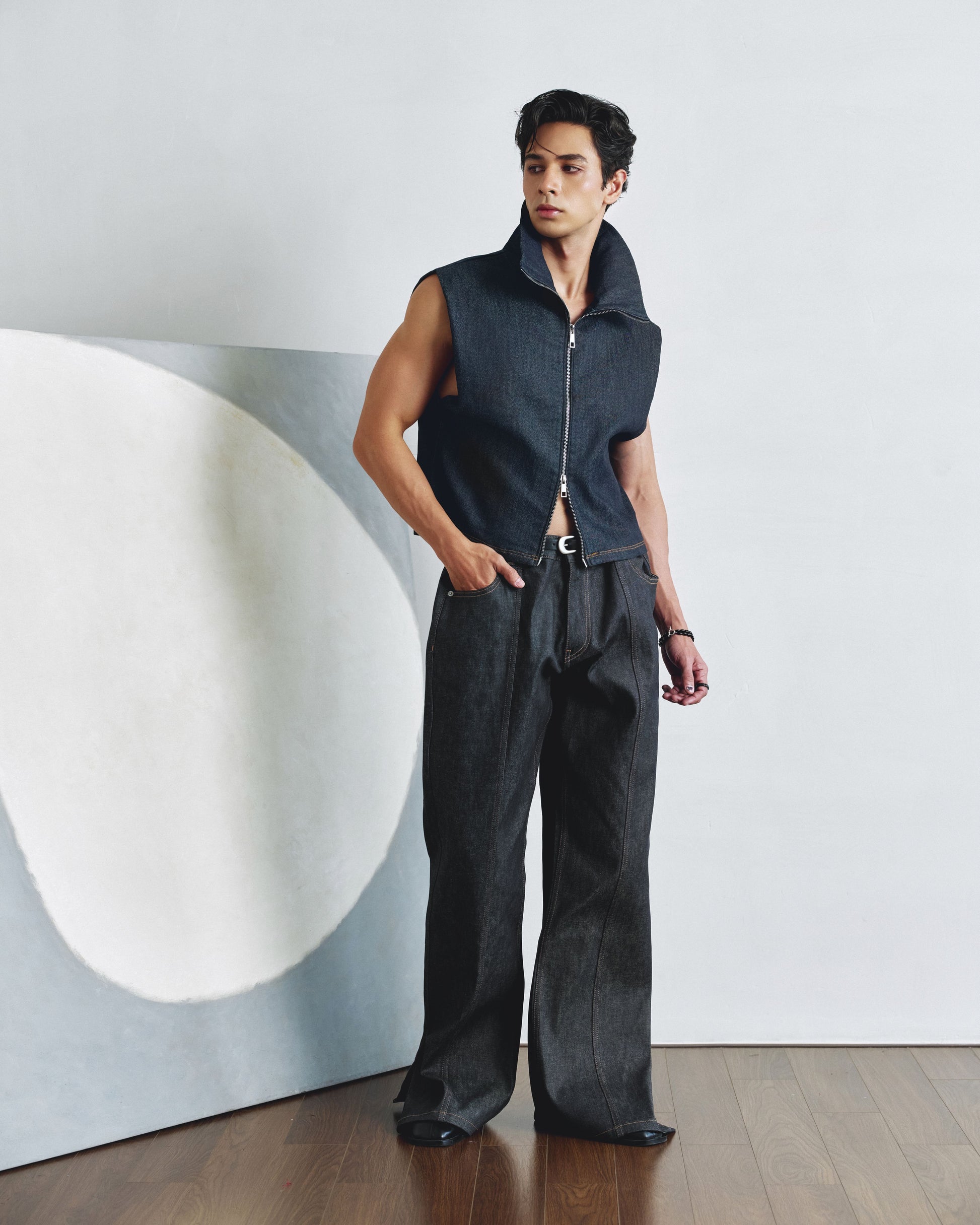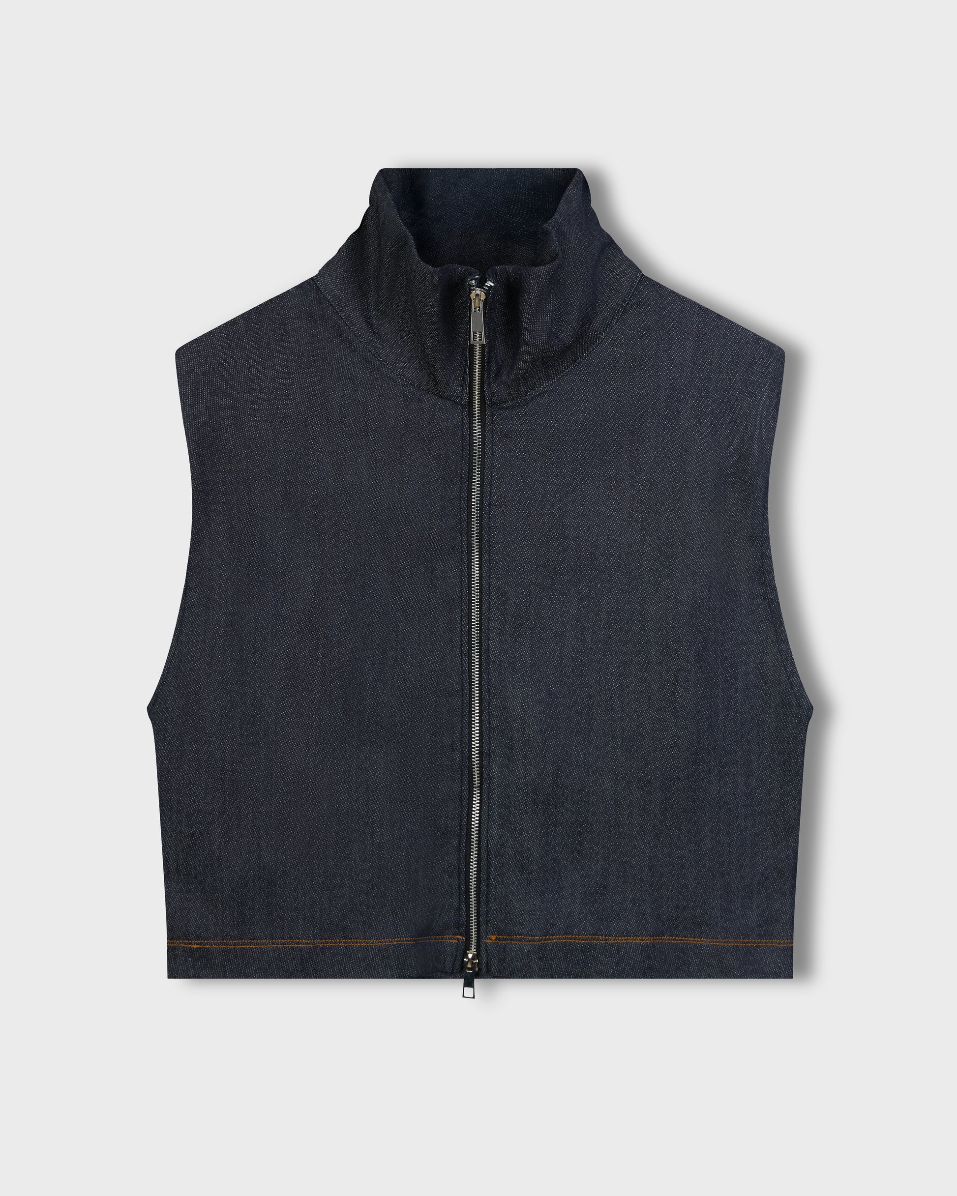Cropped denim vest designed with a wide collar and full zip closure. Finished with contrast seams, this piece brings a sharp, modern touch to layered or standalone looks.