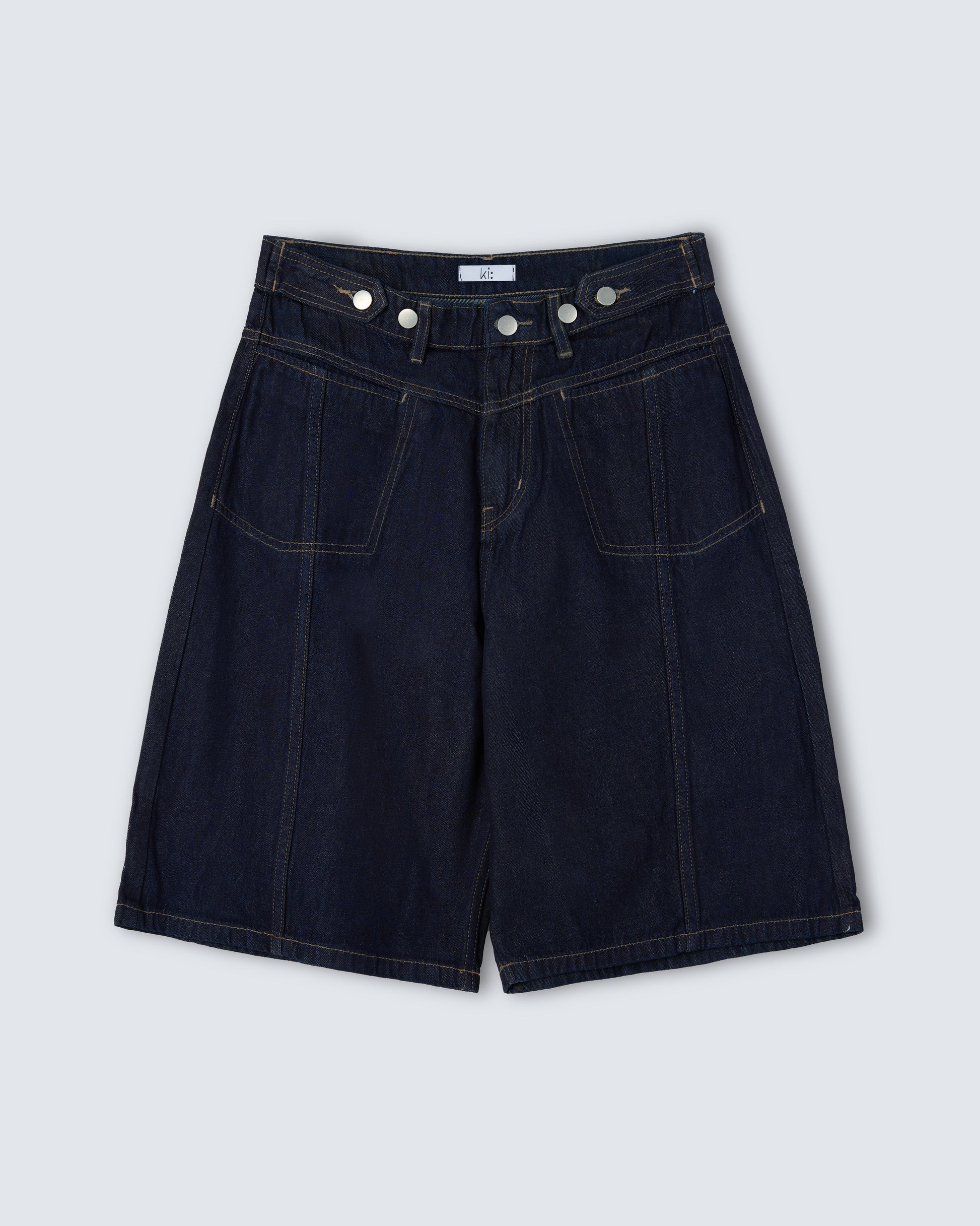 Wide-fit denim shorts in a deep indigo wash. Designed with an extended knee length and contrast stitching, offering a clean, contemporary look that pairs effortlessly with both casual and elevated pieces.