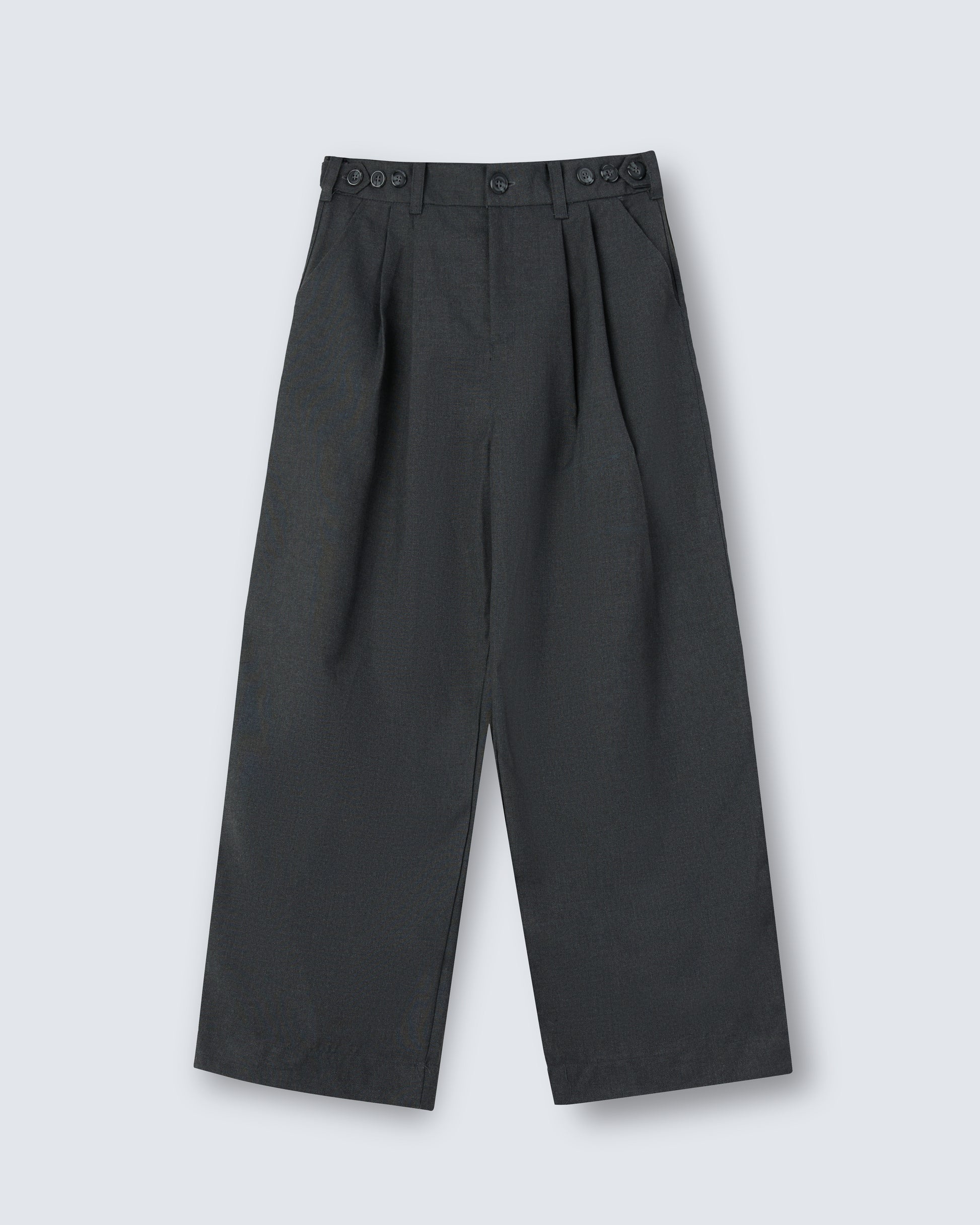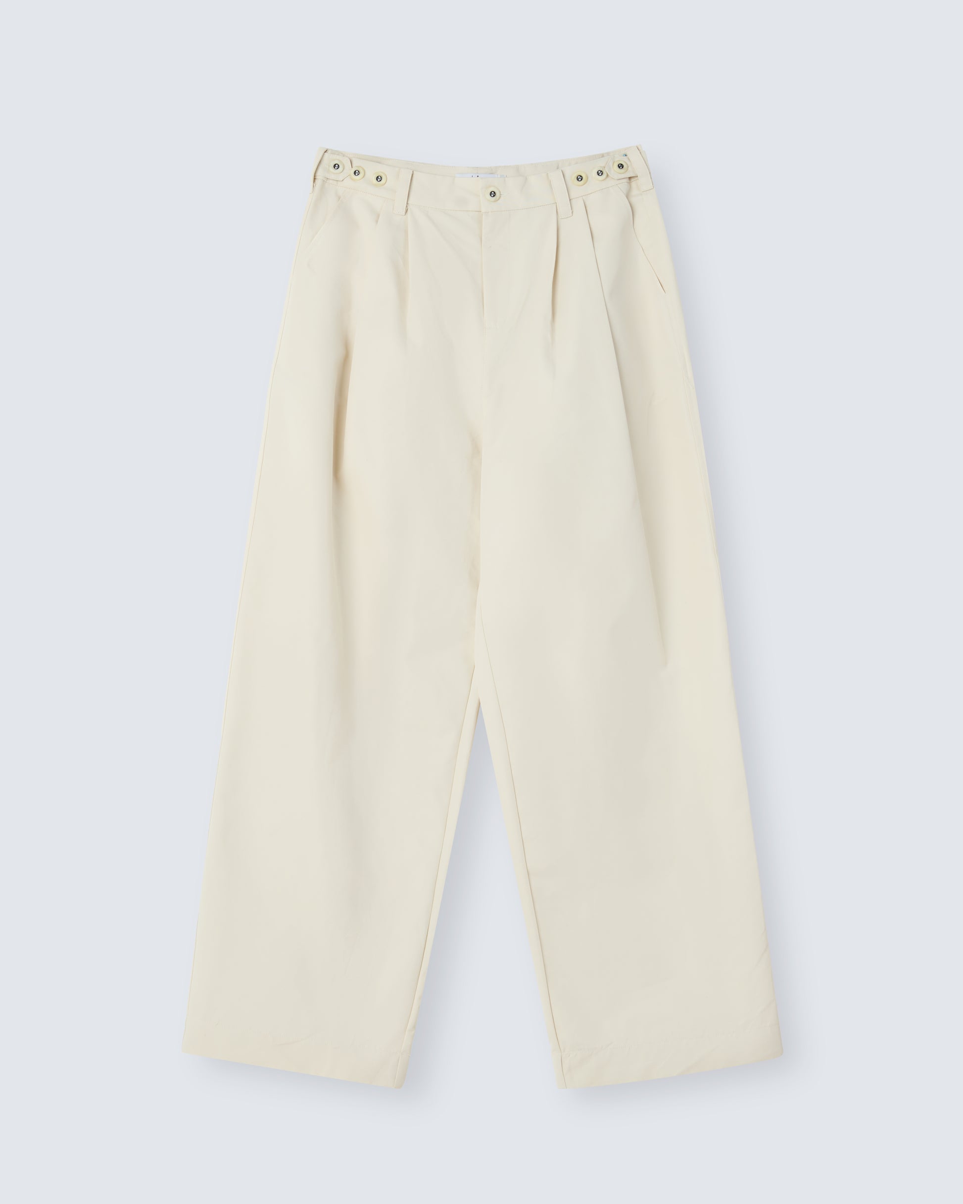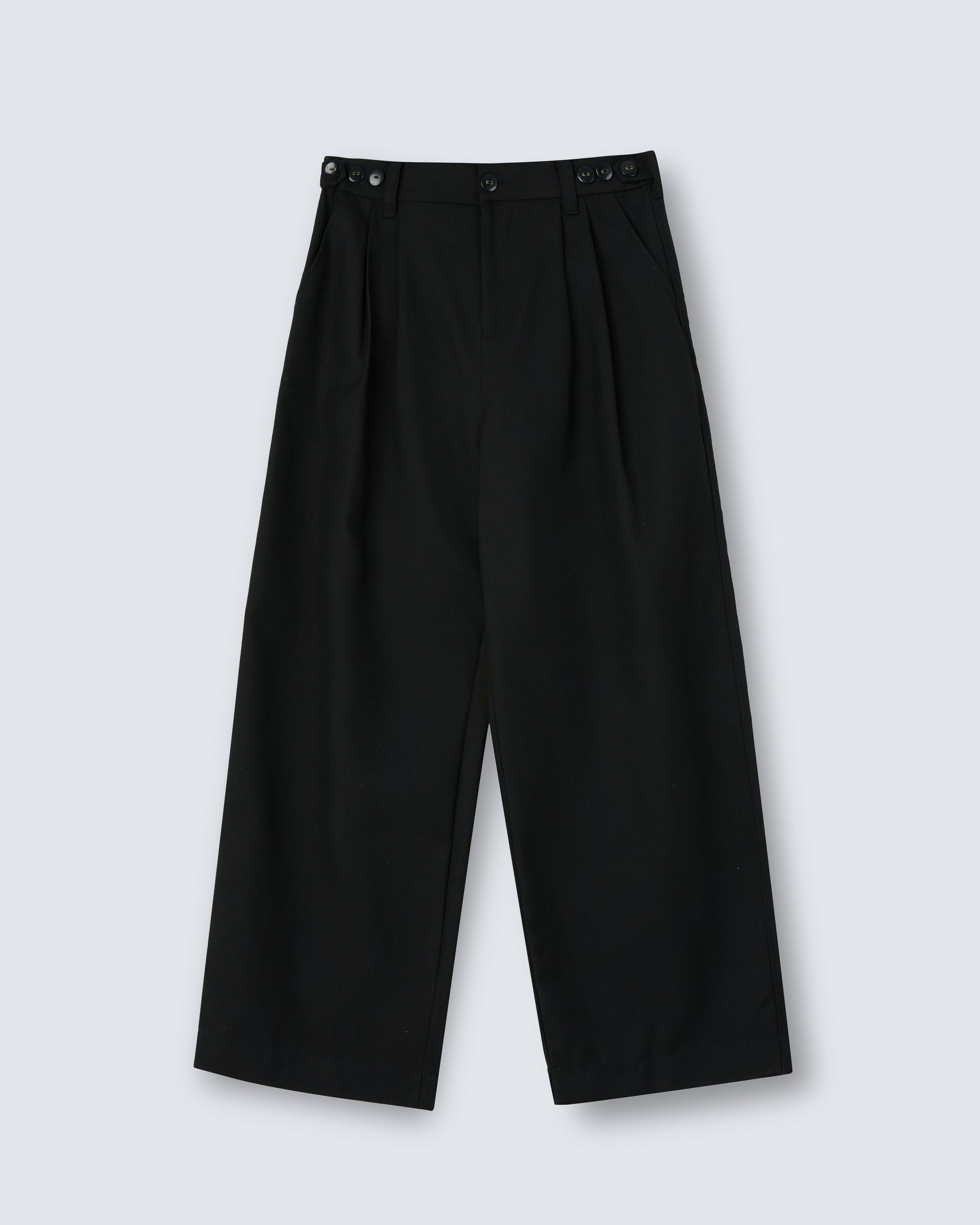 Wide trousers with front pleats and a crisp, tailored finish. The generous cut enhances proportion and movement.
